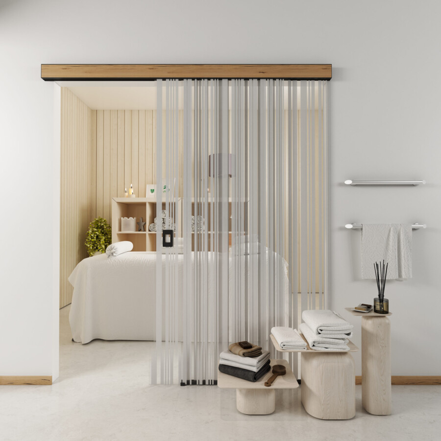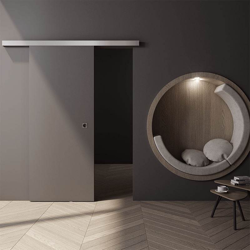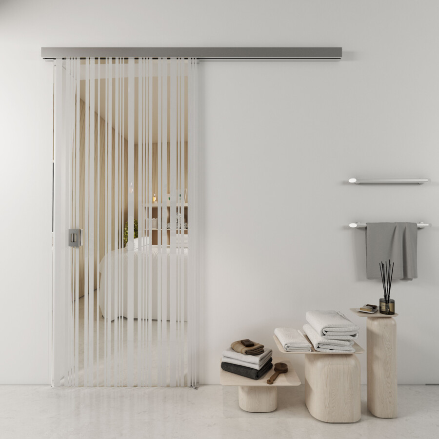 A wall-mounted system with the option of ceiling installation and the possibility of installing a strip between the glass panel and the wall. The system can be used for wide door openings by integrating the system with a fixed glass partition. Wide door openings, integrating the system with a fixed glass partition.
