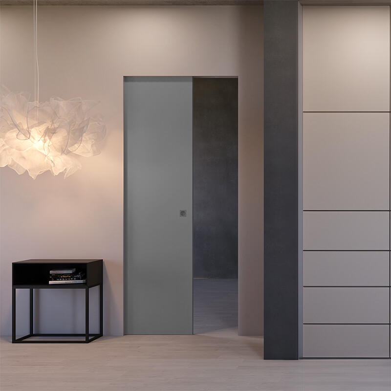 • Раздвижная дверь скрыта в безрамной алюминиевой кассете в стене, а дверное полотно выполнено из МДФ, полностью покрытого матовым лаком Anthracite NCS S 6502-B.