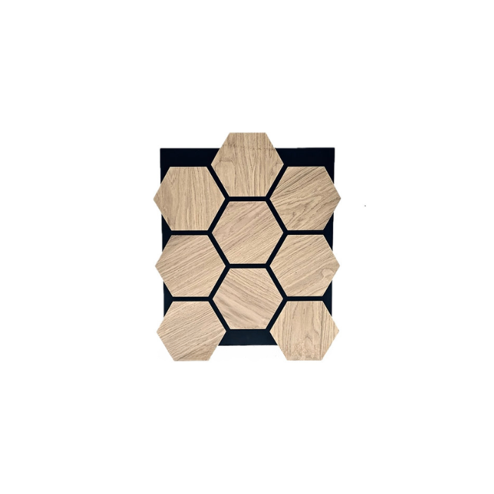 Loodusliku tamme viimistlusega kuusnurksed akustilised paneelid on disainitud ruumi tasakaalustama ja akustikat parandama.