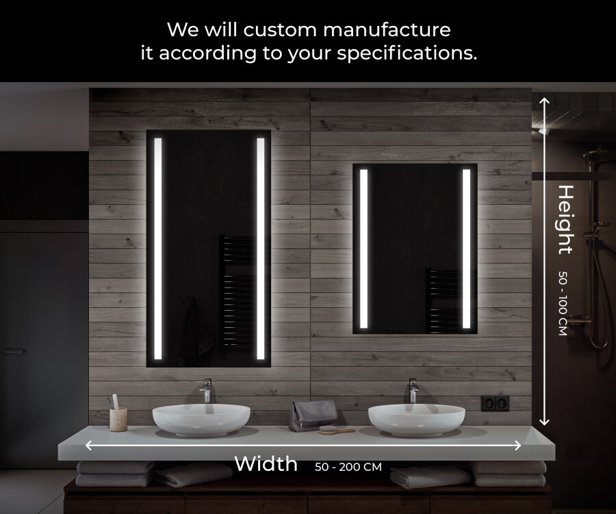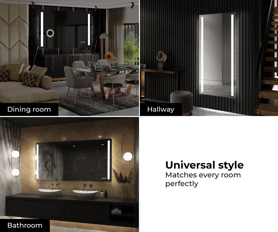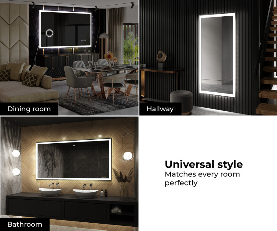 Teie jaoks valmistame kohandatud vannitoapeegleid teie eritellimusel. See muudab ruumi dekori sobivaks lihtsaks. Kohandage ise peegli suurust, raami ääri värvi ja LED-tagavalgustuse tooni (neutraalne või külm).