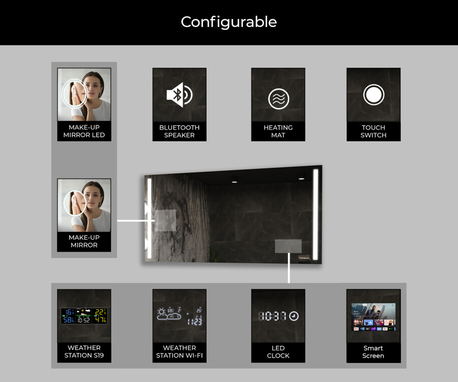 Looge oma täiuslik peegel, valides PremiumLine ja AmbientLine tehnoloogiate vahel, kohandatavate LED-ribade, kosmeetiliste peeglite, kellade/ilmajaamade ja isegi integreeritud kuvaritega. Ristkülikukujuline LED-peegel pakub ilusat valgustust, mida saab täiendada teie valitud dekoratsioonidega.