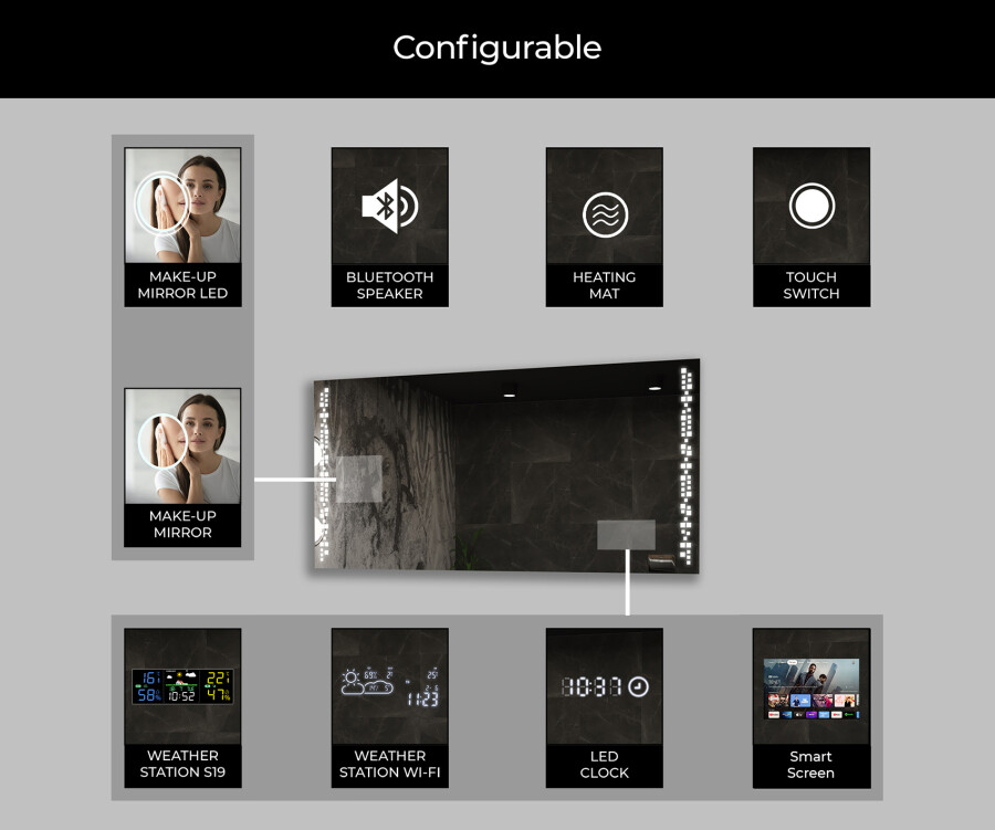 Peegel võib olla varustatud Bluetooth kõlari, kella, ilmateatejaama või nutiekraaniga, võimaldades vaadata filme ja kuulata muusikat otse vannitoas – ideaalne lahendus 21. sajandi interjöörile.