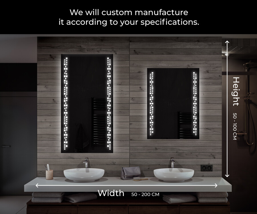 Valmistame eritellimusel vannitoapeegleid, et saaksid hõlpsasti sobitada need oma ruumi sisekujundusega. Kohanda ise peegli suurust, servade värvi ja LED-taustavalguse tooni (neutraalne või külm).