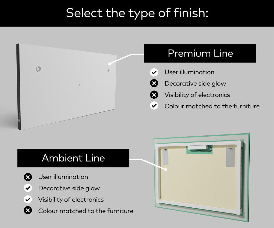 PremiumLine valgustusega peeglid avavad kaasaegses vannitoas laiad disainivõimalused! PremiumLine pakub kuni 19 erinevat kapi dekoori, et sobitada peegel vannitoamööbliga. PremiumLine on loodud nii, et valgus on suunatud otse peegli ees seisvale inimesele.