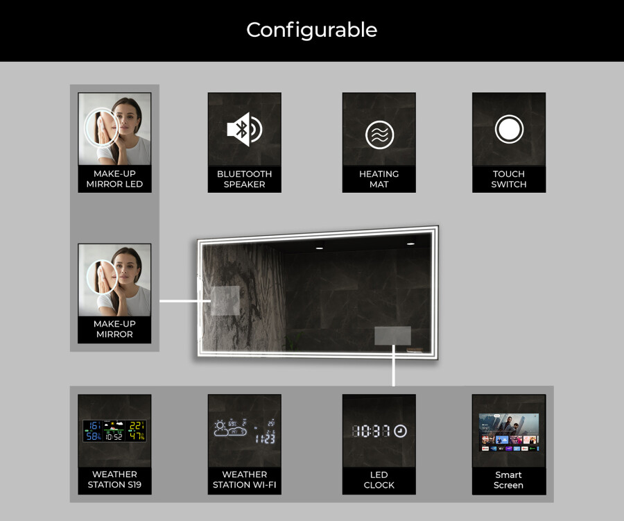 Professionaalne valgustus meigiks ja habemeajamiseks. Kuni 19 erinevat kapidisaini, et sobitada teie vannitoamööbliga.